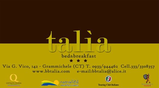 In pieno centro storico, a 50 metri dalla famosa Piazza esagonale Carlo Maria Carafa di Grammichele, in un prestigioso palazzo di fine 800 recentemente restaurato è inserito il lussuoso Bed & Breakfast “Talìa”. L’eleganza, la raffinatezza, il comfort e l’armonia sono le caratteristiche del B&B Talìa, il posto ideale dove trascorrere una piacevole vacanza romantica o un soggiorno lavorativo tranquillo e rilassante.