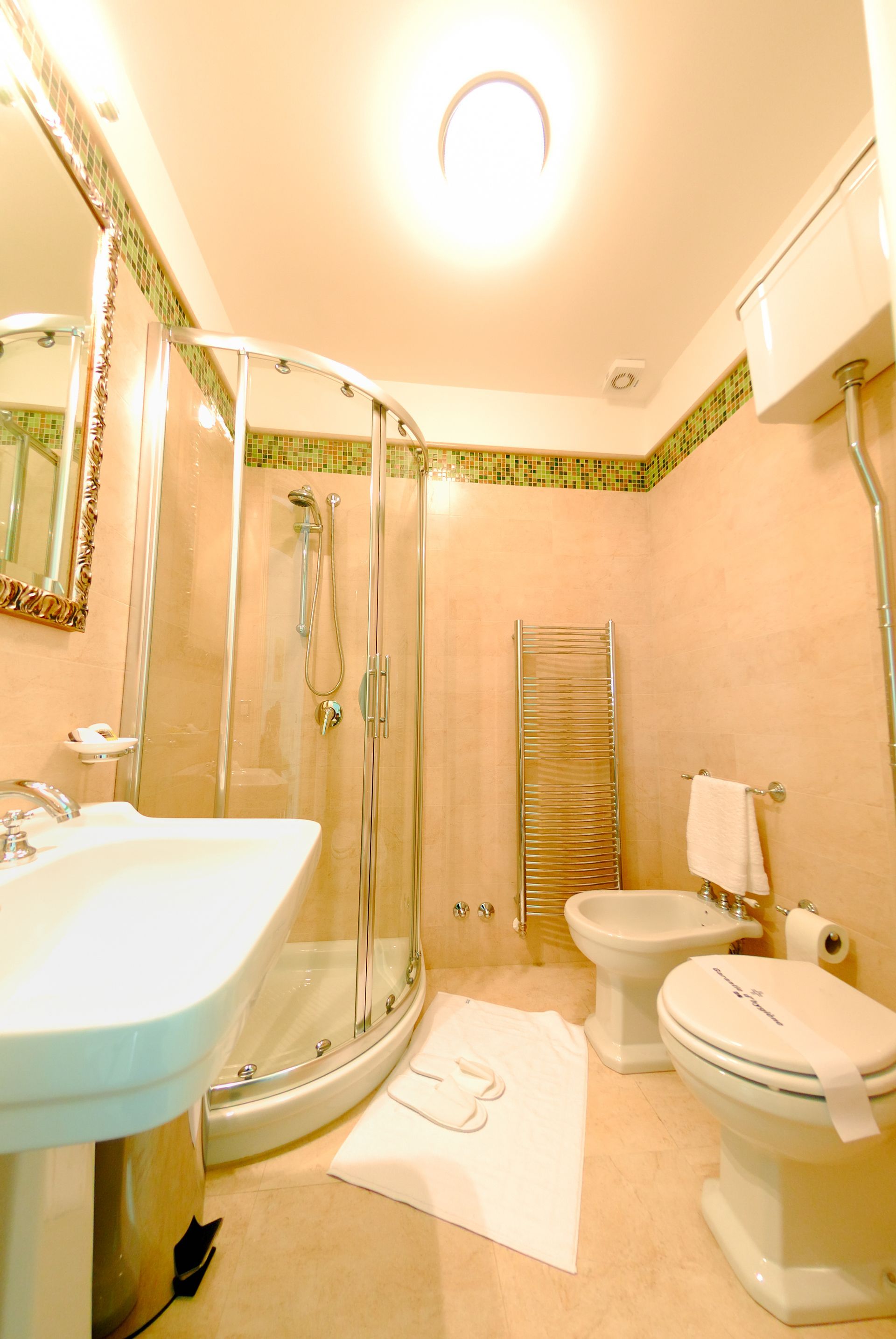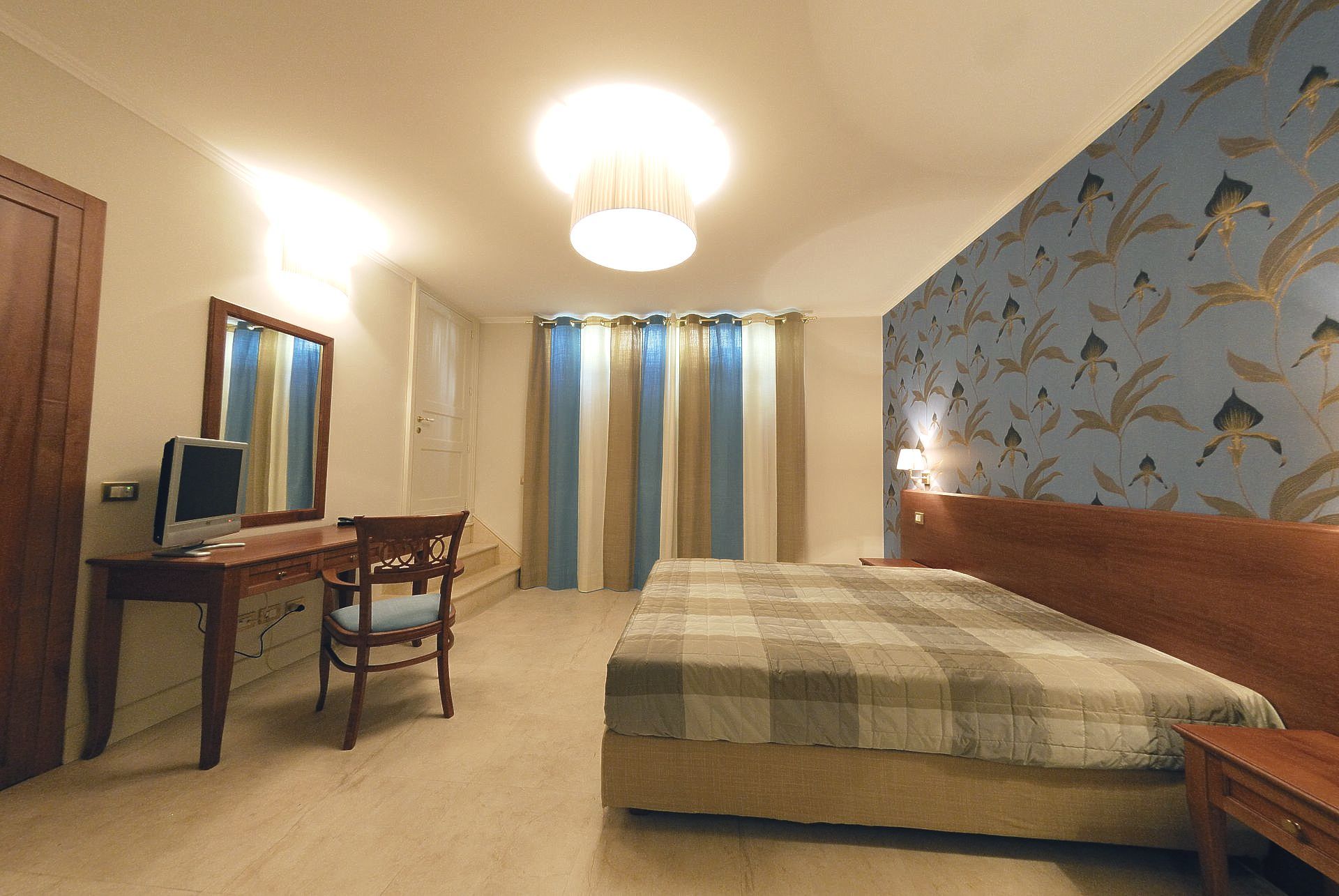 Le camere sono dotate di comodi letti con materassi ortopedici, biancheria da letto in tessuti di alta qualità e rifinita a mano, biancheria da bagno dalle soffici spugne personalizzate. I bagni sono ampi con originali decorazioni in mosaico e doccia con cabina in cristallo.